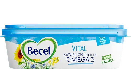 Durch die Kombination von Sonnenblumen-, Raps- und Leinöl enthält Becel Vital Omega 3 und 6 Fettsäuren und weniger gesättigte Fettsäuren als Butter.