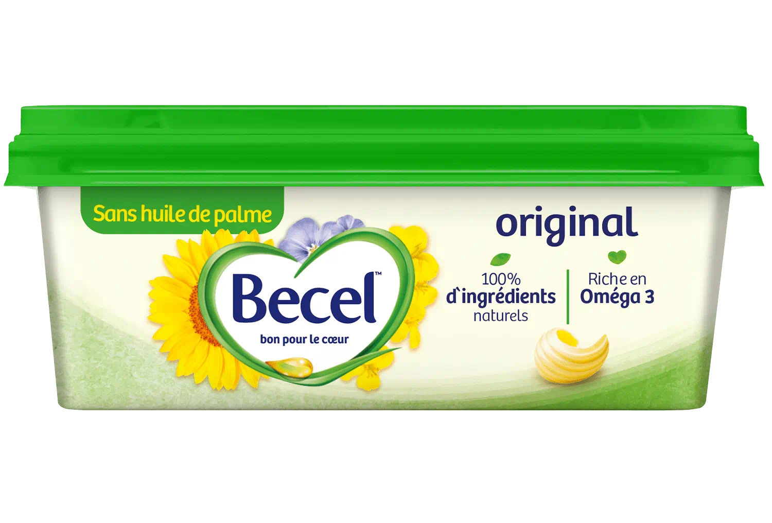 Becel Original est un produit délicieux et facilement tartinable, pour tout ceux qui aiment manger bien et sainement. Il contient 100 % d’ingrédients d’origine naturelle. Becel Original contient un mix de l' huiles de tournesol, de lin et de colza, et contient des Omegas qui sont bons pour le cœur et les artères. Les oméga 3 et 6 aident à maintenir un taux de cholestérol normal dans le sang. L'apport quotidien recommandé est de 2 g d'oméga 3 et de 10 g d'oméga 6. Becel Original sans huile de palme. Notre gamme de produits répond à des besoins diététiques divers.