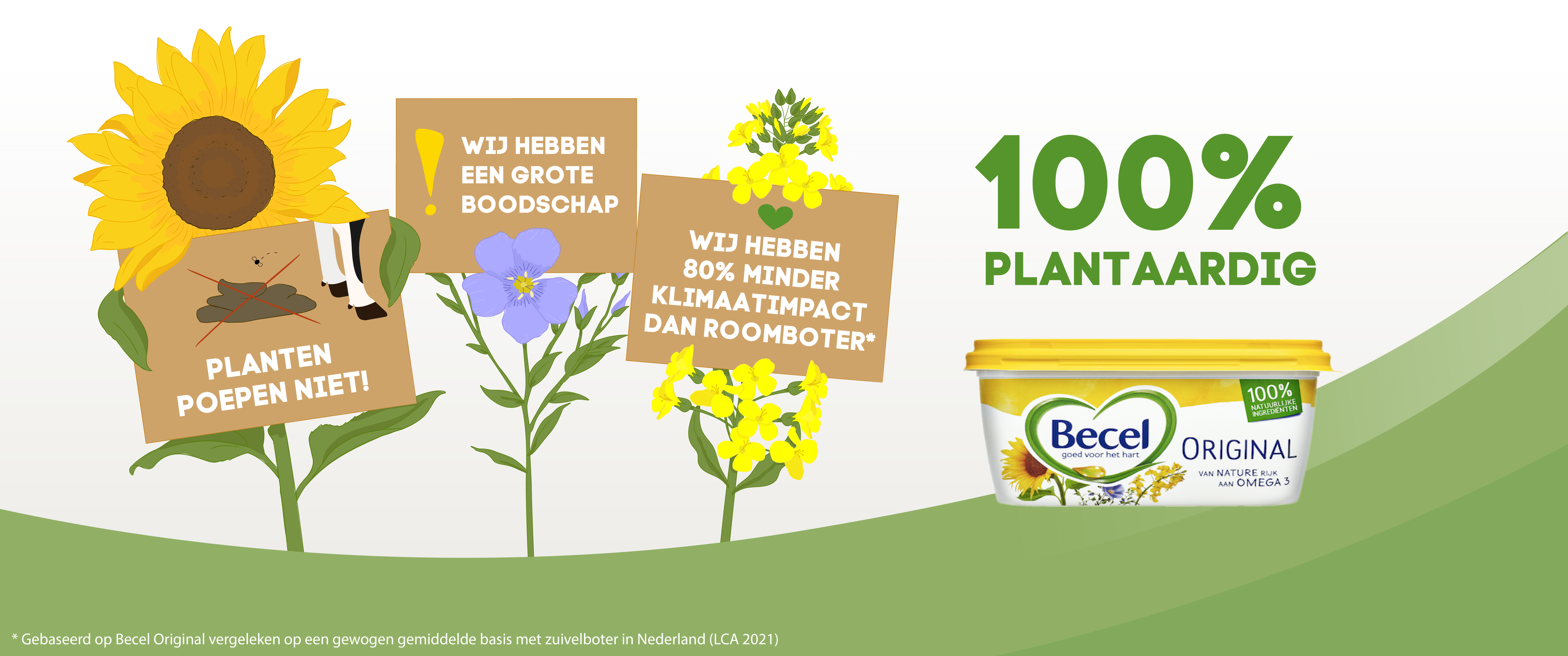 Planten vormen de basis van onze spreads. Het Voedingscentrum adviseert consumenten in haar Richtlijnen Schijf van Vijf om meer plantaardig te eten. De smeerproducten van Becel, zoals Becel. Original, vallen binnen deze richtlijnen. Volgens hen is de belangrijke overweging hierin dat een plantaardig dieet bijdraagt aan het verlagen van broeikasgasemissies. Meer plantaardig eten is een essentiële manier om de druk op ons klimaat tegen te gaan. Bij de productie van dierlijke producten zoals roomboter komt vaak een grote hoeveelheid methaan – een zeer krachtig broeikasgas – vrij die worden veroorzaakt door koeien die poepen en scheten laten. Onafhankelijk onderzoeksbureau Quantis heeft daarnaast een zogenaamde levenscyclusanalyse (lees het onderzoek hier) uitgevoerd om de gehele milieubelasting van de plantaardige spread Becel Original versus de productie van het dierlijke roomboter te meten. Daaruit is gebleken dat: