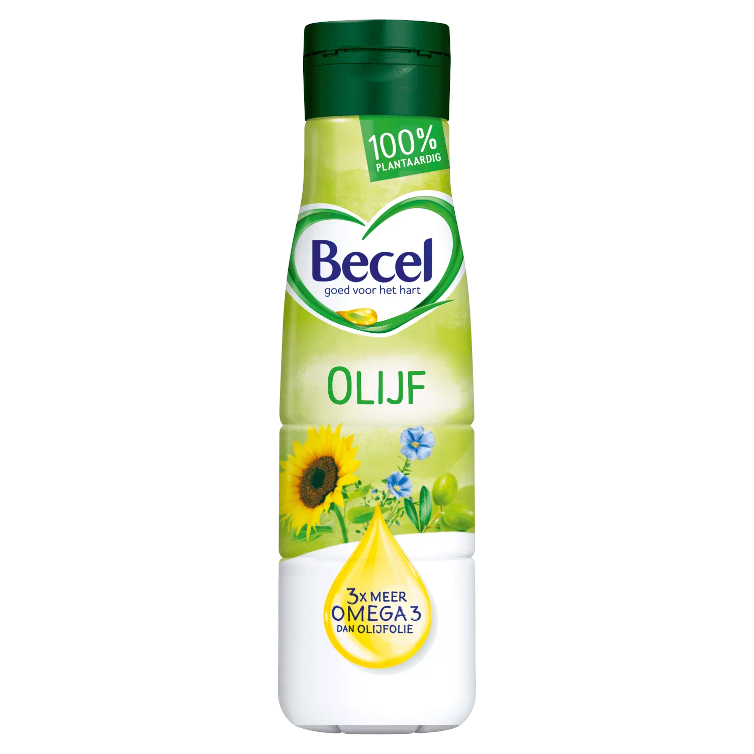 Een vloeibaar product van 100% plantaardige oliën, waarvan 6% olijfolie en 50% linol- en linoleenzuur. Omega 3 (alfa-linoleenzuur) en Omega 6 (linolzuur) zijn meervoudig onverzadigde vetten, die het lichaam niet zelf kan aanmaken. Ze dragen bij aan het behoud van een gezond cholesterolgehalte in het bloed. De benodigde dagelijkse inname die bijdraagt aan het behoud van een gezond cholesterolgehalte is 2g Omega 3 (alfa-linoleenzuur) en 10g Omega 6 (linolzuur). Twee porties (2x10ml) Becel per dag leveren hier een belangrijke bijdrage aan.