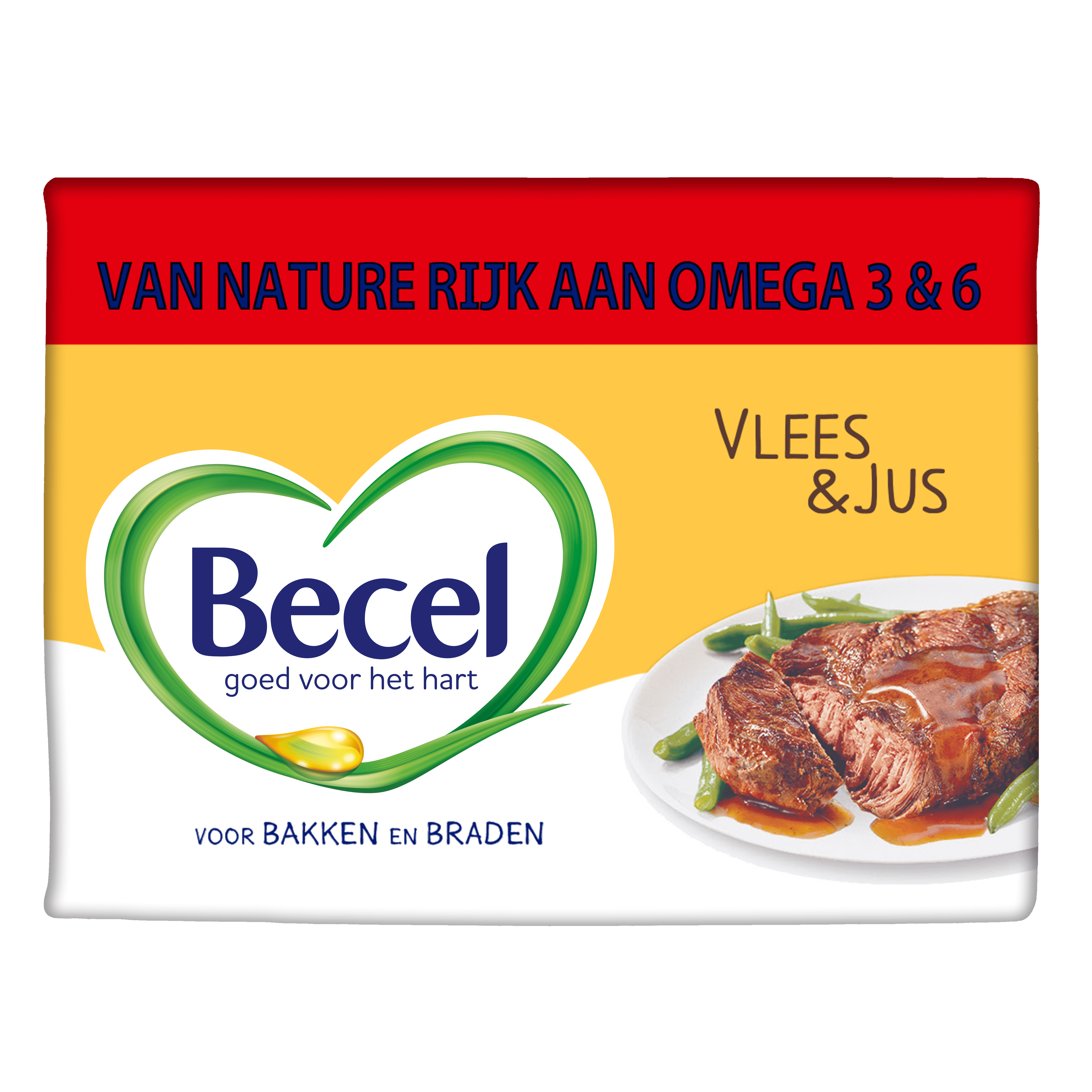 Product van plantaardige olie, bevat 98% vet, waarvan 18% Omega 3 en 6 vetzuren. Omega's 3 & 6 zijn meervoudig onverzadigde vetzuren, die het lichaam niet zelf kan aanmaken. Ze dragen bij aan het behoud van een gezond cholesterolgehalte in het bloed. Becel Vlees & Jus is watervrij, spat niet en bruint snel. Blijf er dus eventjes bij. Zodra het begint te bruinen, kan het vlees in de pan.
