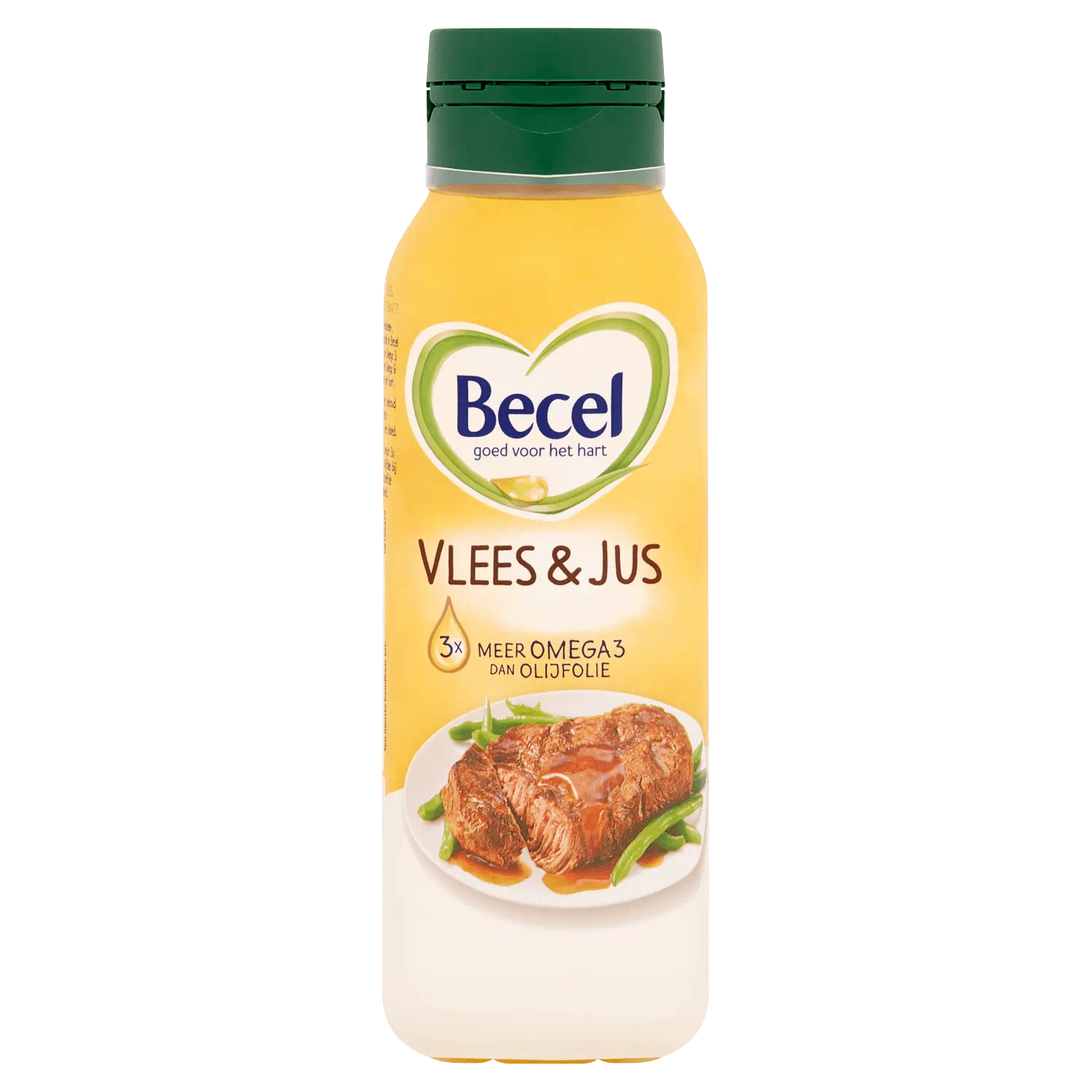 Een product van plantaardige olie, bevat 98% vet, waarvan 50% Omega's 3 en 6. Omega's 3 (alfa-linoleenzuur) en 6 (linoleenzuur) zijn meervoudig onverzadigde vetzuren, die het lichaam niet zelf kan aanmaken. Becel Vlees & Jus is watervrij, spat niet en bruint snel. Blijf er dus eventjes bij. Zodra het begint te bruinen, kan het vlees in de pan. Becel Vlees & Jus is een praktisch product voor in de keuken. Het is verkrijgbaar in een handige knijpfles met doseermaat. Dit product is speciaal geschikt voor het bakken, braden en stoven van vlees. Het voegt smaak toe aan het vlees, zorgt voor een lekkere bruine jus en is vol van smaak. Vloeibare margarine is van nature vloeibaar door al z'n plantaardige oliën. Becel bevat bovendien Omega's 3 en 6 die bijdragen aan het behoud van een gezond cholesterolgehalte in het bloed en daarmee bijdragen aan de gezondheid van het hart.