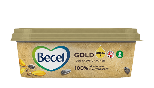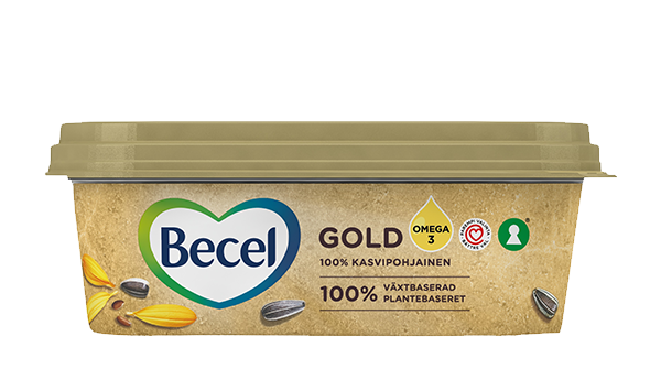 Becel Gold 75% är gjord på solros-, linfrö- och rapsolja som har en hälsosam fettsammansättning med hög andel omättat fett och innehåller omega-3 från växtriket. Becel Gold är mjölkfri, vegansk och självklart nyckelhålsmärkt.